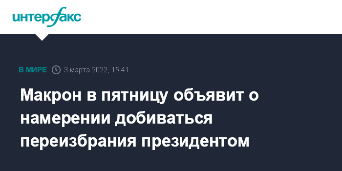 Москва. 3 марта. INTERFAX.RU - Президент Франции Эммануэль Макрон в пятницу официально анонсирует свое решение принять участие в выборах 2022 года, сообщает радиостанция France Info со ссылкой на источники.