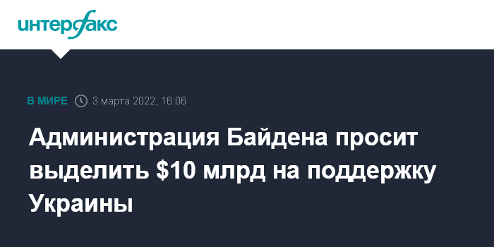 Москва. 3 марта. INTERFAX.RU - Администрация президента США Джозефа Байдена просит Конгресс выделить $10 млрд на поддержку Украины, сообщает в четверг The Washington Post со ссылкой на два источника, знакомых с этим вопросом.