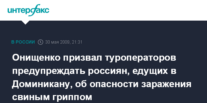 Руководитель Роспотребнадзора, главный государственный санитарный врач РФ Г.Онищенко сообщил "Интерфаксу" в субботу вечером, что его ведомство направило в Федеральное агентство по туризму письмо о мерах по предупреждению завоза гриппа A(H1N1) в Россию из Доминиканской Республики.