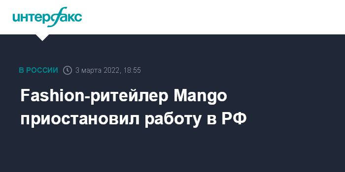 "Ввиду текущих трудностей, связанных с транспортировкой и поставками, компания Mango не может гарантировать обеспечение своей деятельности в России. В связи с этим Mango временно прекращает свою работу в этой стране", - говорится в сообщении на сайте компании.