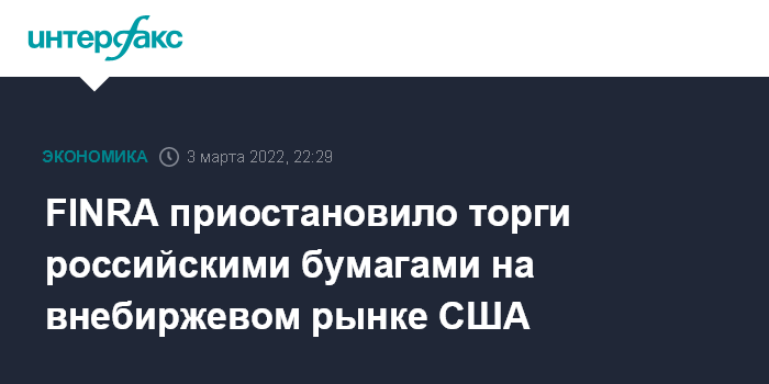 Москва. 3 марта. INTERFAX.RU - Американское Агентство по регулированию деятельности финансовых институтов (FINRA) в четверг заморозило внебиржевые торги акциями ряда российских компаний с листингом в США.