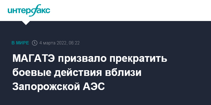 Москва. 4 марта. INTERFAX.RU - Международное агентство по атомной энергии (МАГАТЭ) обратилось с призывом к вооруженным силам России и Украины воздержаться от проведения боевых действий вблизи Запорожской АЭС.