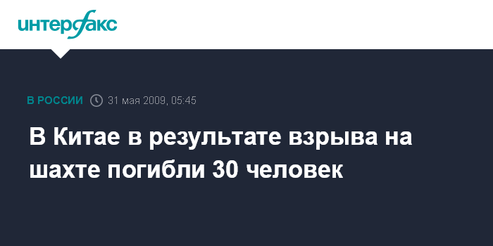 Пекин. 31 мая. ИНТЕФАКС-КИТАЙ - На юго-западе Китая в результате взрыва на угольной шахте в районе города Чунцина в субботу погибли 30 горняков, сообщили в воскресенье местные СМИ.
