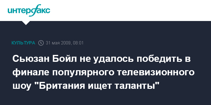 Москва. 31 мая. ИНТЕРФАКС - 48-летней домохозяйке из Шотландии Сьюзан Бойл не смогла победить в популярном телевизионном шоу "Britain‘s Got Talent" ("Британия ищет таланты"), результаты которого были объявлена в субботу вечером.