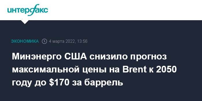 Москва. 4 марта. INTERFAX.RU - Минэнерго США (EIA) обновило прогноз максимально возможной цены на нефть марки Brent к 2050 году, слегка снизив его - с $173 до $170 за баррель, следует из прогноза Annual Energy Outlook 2022 (AEO), подготовленного EIA.