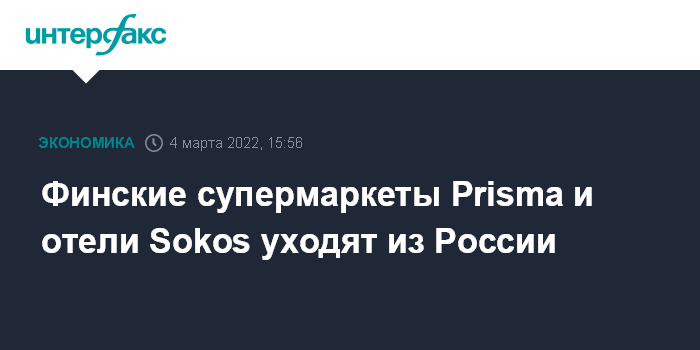 Москва. 4 марта. INTERFAX.RU - Финский холдинг S-Group, управляющий сетями супермаркетов Prisma и отелями Sokos, сообщил, что прекращает операционную деятельность в России из-за военной операции на Украине.