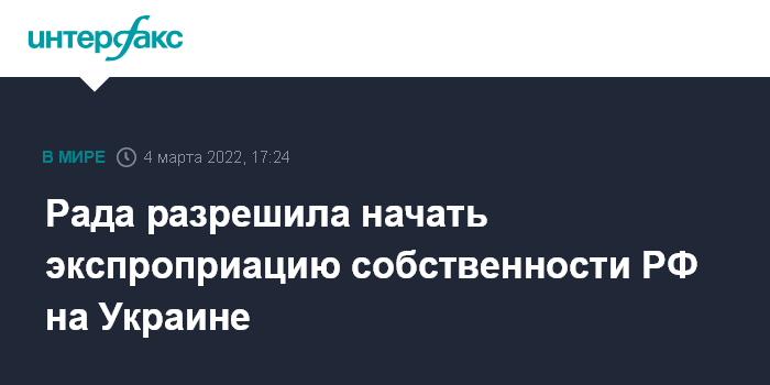Москва. 4 марта. INTERFAX.RU - Верховная рада разрешила начать процесс изъятия имущества и средств Российской Федерации и её резидентов, находящихся на территории Украины, сообщает пресс-служба партии "Слуга народа".