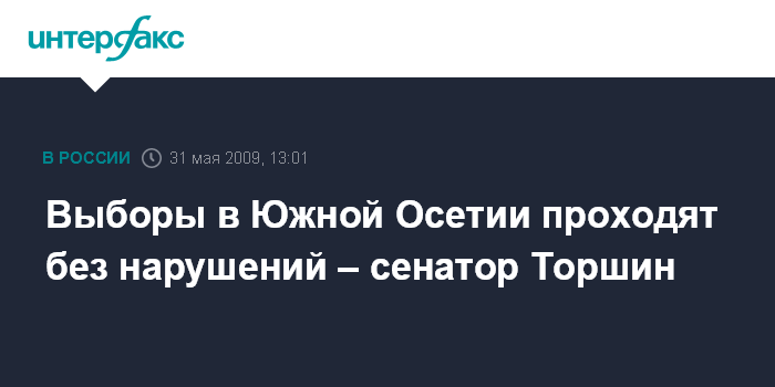 Москва. 31 мая. INTERFAX.RU - Российские наблюдатели, находящиеся в Южной Осетии, не выявили каких-либо серьезных нарушений в ходе выборов в парламент этой республики, сообщил "Интерфаксу" глава комиссии по Кавказу, сформированной при совете законодателей в верхней палате парламента, первый вице-спикер Совета Федерации Александр Торшин.