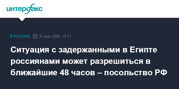 Каир. 31 мая. INTERFAX.RU - Египетские власти обещают решить вопрос об освобождении российских граждан, задержанных в Каире, в течение ближайших двух дней, сообщил "Интерфаксу" в воскресенье второй секретарь посольства РФ в Египте Юсуп Абакаров.