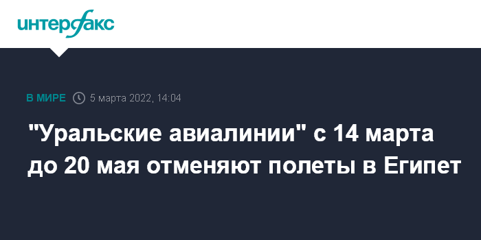 Москва. 5 марта. INTERFAX.RU - Авиакомпания "Уральские авиалинии" с 5 по 13 марта будет осуществлять только вывозные рейсы из Египта, с 14 марта полетная программа в Египет будет отменена как минимум до 20 мая 2022 года, говорится в сообщении авиаперевозчика.