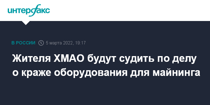 Москва. 5 марта. INTERFAX.RU - В Ханты-Мансийском автономном округе в суд поступит дело о краже оборудования для майнинга криптовалюты на сумму более 2,7 млн рублей, сообщила прокуратура региона.