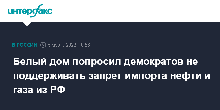 Москва. 5 марта. INTERFAX.RU - Администрация Белого дома просит сенаторов от Демократической партии не поддерживать законопроект, который может запретить импорт нефти и газа из России. Об этом сообщает портал Axios со ссылкой на помощников демократов в Сенате.