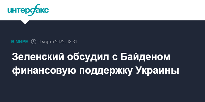 Москва. 6 марта. INTERFAX.RU - Президент Украины Владимир Зеленский обсудил по телефону с лидером США Джо Байденом дальнейшую поддержку Киева со стороны Вашингтона и антироссийские санкции за военную операцию РФ.