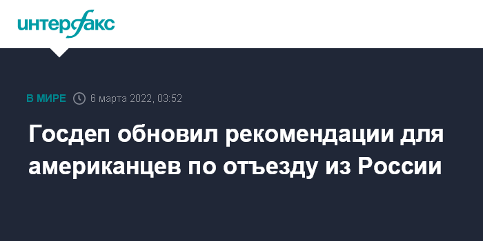 Москва. 6 марта. INTERFAX.RU - Госдепартамент США в обновленных рекомендациях, касающихся России, советует американцам срочно покинуть российскую территорию.