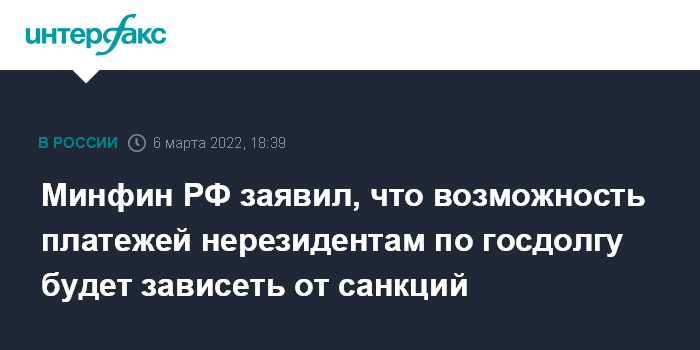 Минфин РФ заявил, что возможность платежей нерезидентам по госдолгу будет зависеть от санкций