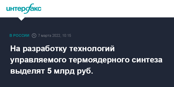 "Дополнительные ассигнования планируется направить на разработку технологий управляемого термоядерного синтеза и инновационных плазменных технологий", - говорится в сообщении.