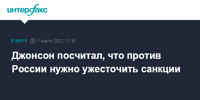 Москва. 7 марта. INTERFAX.RU - Премьер Великобритании Борис Джонсон в понедельник заявил, что по-прежнему выступает за усиление санкций в отношении России, в частности, в банковском секторе, а также в плане ограничения доступа к платежной системе SWIFT.
