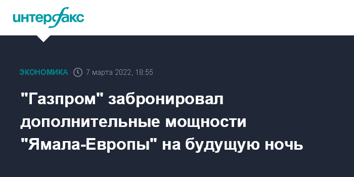 Москва. 7 марта. INTERFAX.RU - "Газпром" забронировал дополнительные транспортные мощности газопровода "Ямал-Европа" на ночь с понедельника на вторник, свидетельствуют итоги внутридневного аукциона бронирования на платформе GSA Platform.