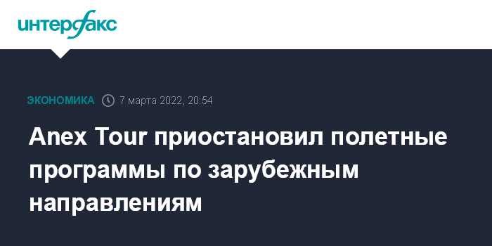 О приостановке полетов за рубеж с 8 марта в числе прочих российских авиакомпаний ранее объявила AZUR air, партнер туроператора Anex Tour. Авиакомпания сообщила, что продолжит выполнять вывозные рейсы для россиян, которые сейчас находятся за рубежом: в Мексике, Доминикане, Кубе, Турции, Египте, Вьетнаме и на Мальдивских островах. После 8 марта в вывозной программе будут задействованы самолеты, зарегистрированные в государственном реестре воздушных судов РФ.