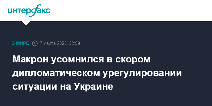 Москва. 7 марта. INTERFAX.RU - Президент Франции Эммануэль Макрон в понедельник заявил, что не считает вероятным урегулирование ситуации на Украине путем переговоров в ближайшие дни, но все же надеется на это.