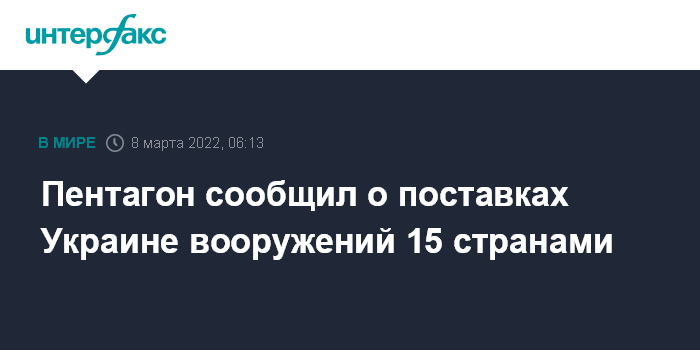 Москва. 8 марта. INTERFAX.RU - В настоящее время военная помощь Украине поступает из 15 стран мира, сообщил журналистам пресс-секретарь Пентагона Джон Кирби.