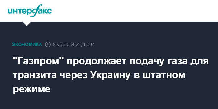 Москва. 8 марта. INTERFAX.RU - Загрузка украинского транзитного коридора во вторник остается на прежнем высоком уровне, соответствуя объемам долгосрочного контракта (40 млрд куб. м в год, или 109 млн куб. м в сутки).