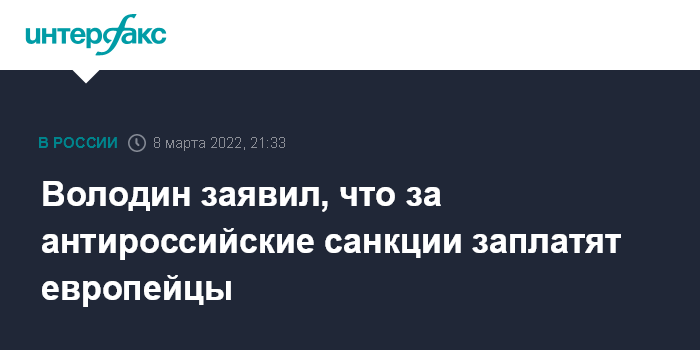 Москва. 8 марта. INTERFAX.RU - Спикер Думы Вячеслав Володин заявил, что европейские санкции в отношении России обернутся издержками для бизнеса и граждан Евросоюза, а выгоду получат американцы.