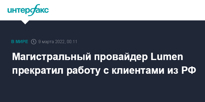 Москва. 9 марта. INTERFAX.RU - Американский магистральный провайдер Lumen заявил о немедленном прекращении всех операций на территории России.