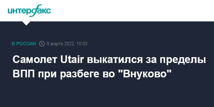 Москва. 9 марта. INTERFAX.RU - Самолет авиакомпании Utair выкатился за пределы взлетно-посадочной полосы при разбеге в аэропорту "Внуково" во вторник, 8 марта, сообщили в пресс-службе компании.