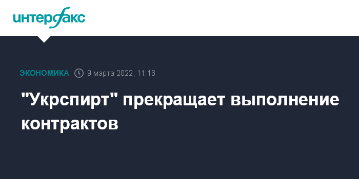 Москва. 9 марта. INTERFAX.RU - ГП "Укрспирт" вынуждено отказаться от выполнения ранее заключенных договоров и обязательств, а также отдельных налоговых и других обязанностей в связи с форс-мажорными обстоятельствами, сообщается на сайте "Укрспирта".