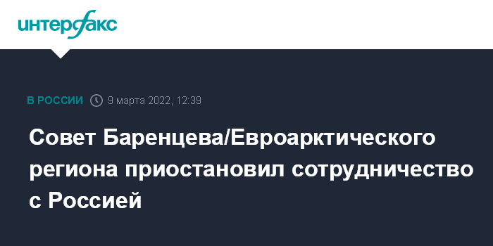 Москва. 9 марта. INTERFAX.RU - Страны-участницы Совета Баренцева/Евроарктического региона объявили о приостановке сотрудничества с Россией, говорится в коммюнике на сайте организации.