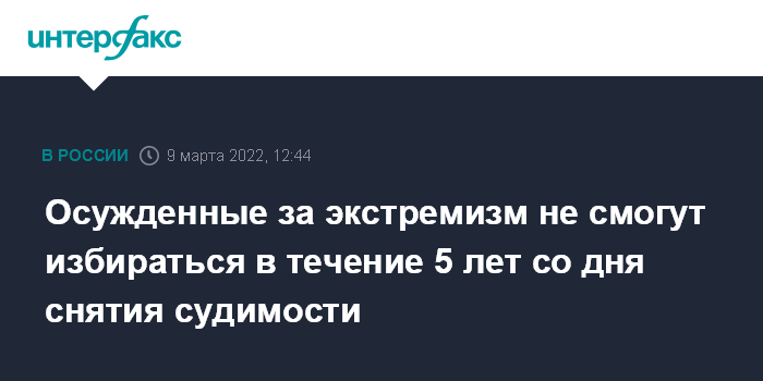 Москва. 9 марта. INTERFAX.RU - Комитет Госдумы по госстроительству и законодательству в среду одобрил поправку, согласно которой не имеют права быть избранными граждане РФ, осужденные за совершение преступлений экстремистской направленности до истечения пяти лет со дня снятия или погашения судимости.