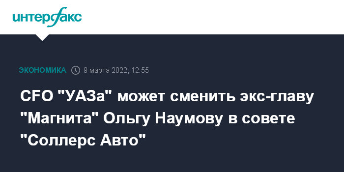 Топ-менеджер "УАЗа" в случае утверждения ее кандидатуры сменит в совете Ольгу Наумову, работавшую в структурах "Северстали" и НЛМК (2001-2013 годы), возглавлявшую розничные сети "Пятерочка" и "Магнит" (2013-2019 годы), в начале этого года ставшую гендиректором "Русской рыбопромышленной компании". Как уточнили "Интерфаксу" в пресс-службе "Соллерса", Наумова, возглавлявшая логистический оператор Lorus SCM (входит в периметр "Соллерса") в 2019-2021 годах, на данный момент не занимает должностей в структуре группы.