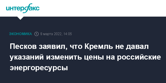 Песков заявил, что Кремль не давал указаний изменить цены на российские энергоресурсы