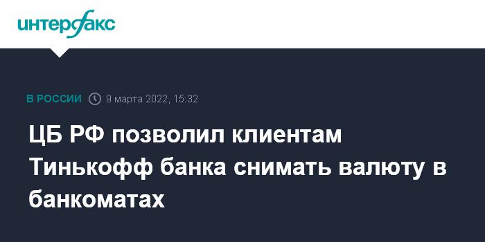 Москва. 9 марта. INTERFAX.RU - ЦБ РФ предоставил клиентам Тинькофф банка, у которого нет отделений, возможность снимать доллары по открытым до 9 марта счетам в банкоматах.