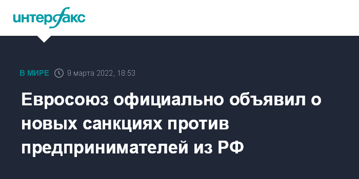 Москва. 9 марта. INTERFAX.RU - Целая группа предпринимателей и руководителей крупнейших российских компаний пополнила санкционный список Евросоюза.