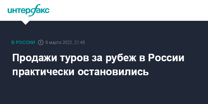 "По данным турагентств, продажи туров за рубеж на неделе с 28 февраля по 6 марта сократились почти на 70% по сравнению с последней неделей февраля, на которой спрос также снизился на 70%. Объемы продаж туров по России также снижаются, но не так сильно", - говорится в сообщении.