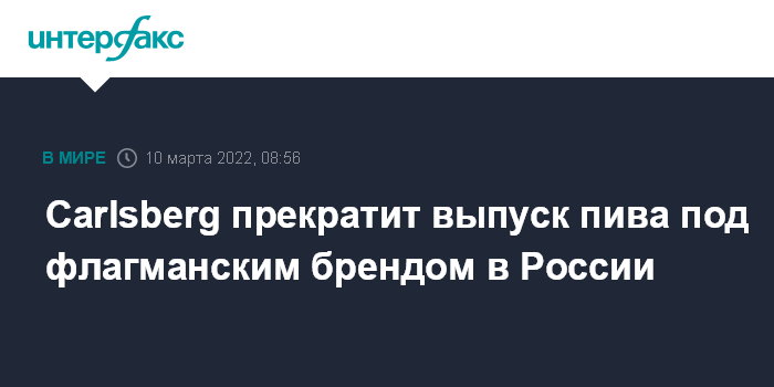 Москва. 10 марта. INTERFAX.RU - Датский концерн Carlsberg, владеющий российской пивоваренной компанией "Балтика", сообщил, что прекращает производить в России пиво под своим флагманским брендом Carlsberg, а также отказывается от рекламы на российском рынке.