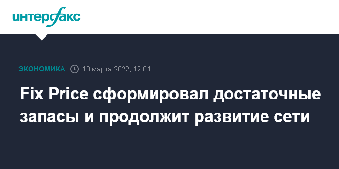 Москва. 10 марта. INTERFAX.RU - Ритейлер Fix Price, управляющий крупнейшей в РФ сетью магазинов фиксированных цен, сформировал достаточные товарные запасы, несмотря на перебои в цепочках поставок.