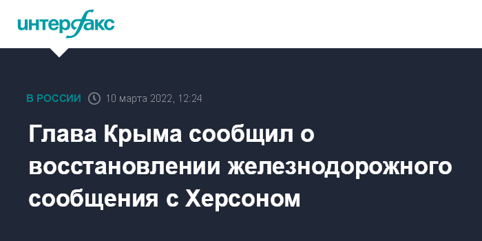 Москва. 10 марта. INTERFAX.RU - Восстановлено техническое железнодорожное движение от Крыма до украинского Херсона, сообщил глава республики Сергей Аксенов.