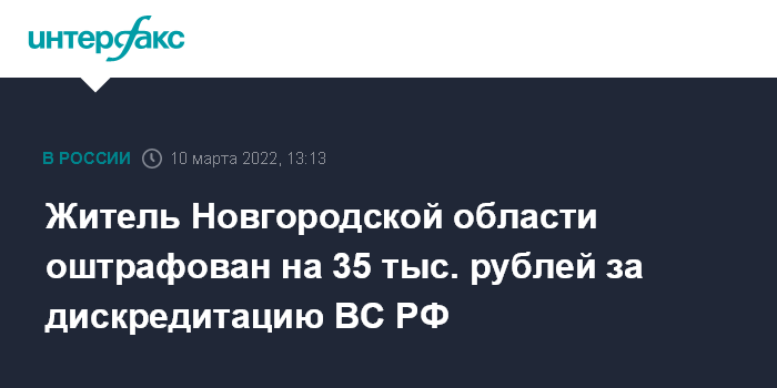 Житель Новгородской области оштрафован на 35 тыс. рублей за дискредитацию ВС РФ