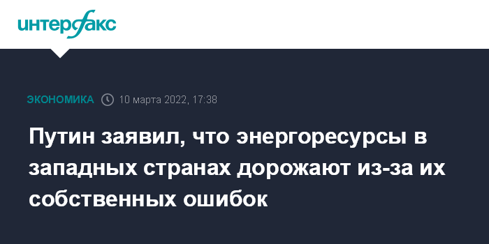 Москва. 10 марта. INTERFAX.RU - Рост цен на энергоресурсы в западных странах, в том числе в США, вызван просчетами руководства этих стран, а не действиями России, заявил президент РФ Владимир Путин.