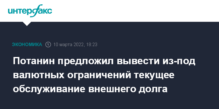 Москва. 10 марта. INTERFAX.RU - Глава "Норникеля" Владимир Потанин предлагает вывести из-под действия существующего положения о валютных ограничениях текущее обслуживание внешнего долга.