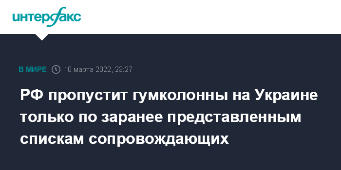 Москва. 10 марта. INTERFAX.RU - В состав гуманитарных колонн, выезд которых запланирован на 11 марта из ряда городов Украины, будут пускать по заранее предоставленным спискам транспорта и должностных лиц, сообщил руководитель российского межведомственного штаба по гуманитарному реагированию на Украине, начальник Национального центра управления обороной РФ Михаил Мизинцев.