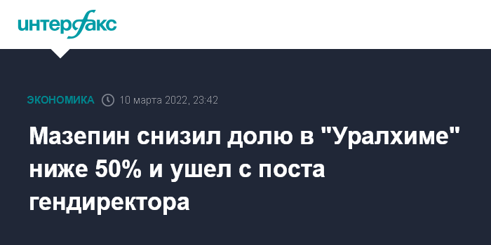 Москва. 10 марта. INTERFAX.RU - Дмитрий Мазепин, попавший под санкции ЕС, снизил долю в "Уралхиме" ниже контрольной, сообщила компания.