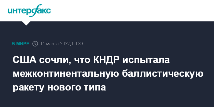 Москва. 11 марта. INTERFAX.RU - Администрация США пришла к выводу, что Северная Корея (КНДР) недавно провела испытание межконтинентальной баллистической ракеты (МБР) нового типа, сообщает Associated Press со ссылкой на информированные источники.