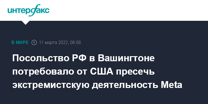 "Вызывает возмущение агрессивная и преступная политика Meta, ведущая к разжиганию ненависти и вражды к россиянам. Действия компании - еще одно свидетельство объявленной нашей стране информационной войны без правил. Медиакорпорации стали солдатами пропагандистcкой машины западных правящих кругов. Требуем от американских властей пресечь экстремистскую деятельность Meta и принять меры по привлечению виновных к ответственности", - говорится в комментарии посольства России в США в связи с экстремистской деятельностью корпорации Meta.