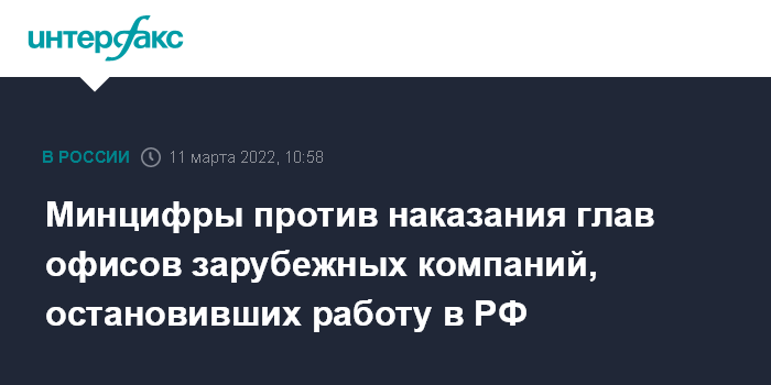 Москва. 11 марта. INTERFAX.RU - Министерство цифрового развития связи и массовых коммуникаций РФ выступило против введения административной или уголовной ответственности для руководителей российских офисов иностранных компаний, приостановивших работу в России.