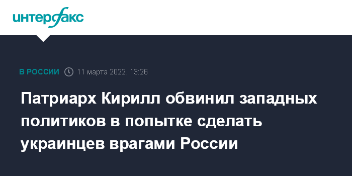 Москва. 11 марта. INTERFAX.RU - Патриарх Московский и всея Руси Кирилл осудил Запад за намерение изменить менталитет жителей Украины, сделать их врагами России, с народом которой они связаны "общей исторической судьбой". Предстоятель РПЦ написал об этом исполняющему обязанности генсека Всемирного совета церквей протоиерею Иоанну Сауке.