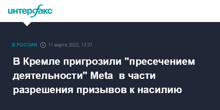 В Кремле пригрозили "пресечением деятельности" Meta в части разрешения призывов к насилию